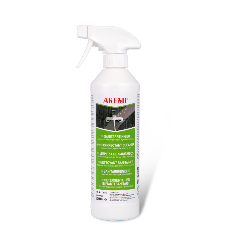 LIMPIEZA DE SANITARIOS Producto de limpieza ácido para eliminar con rapidez y de forma duradera las incrustaciones de cal difíciles de quitar, manchas de óvido, restos de jabón y suciedades de piedras naturales y artificiales, resistentes a los ácidos, baldosas y plásticos, así como en cristal y acero inoxidable en las cocinas, espacios húmedos e instalaciones de saneamiento. ¡No adecuado para piedras calizas y otras piedras sensibles a los ácidos!