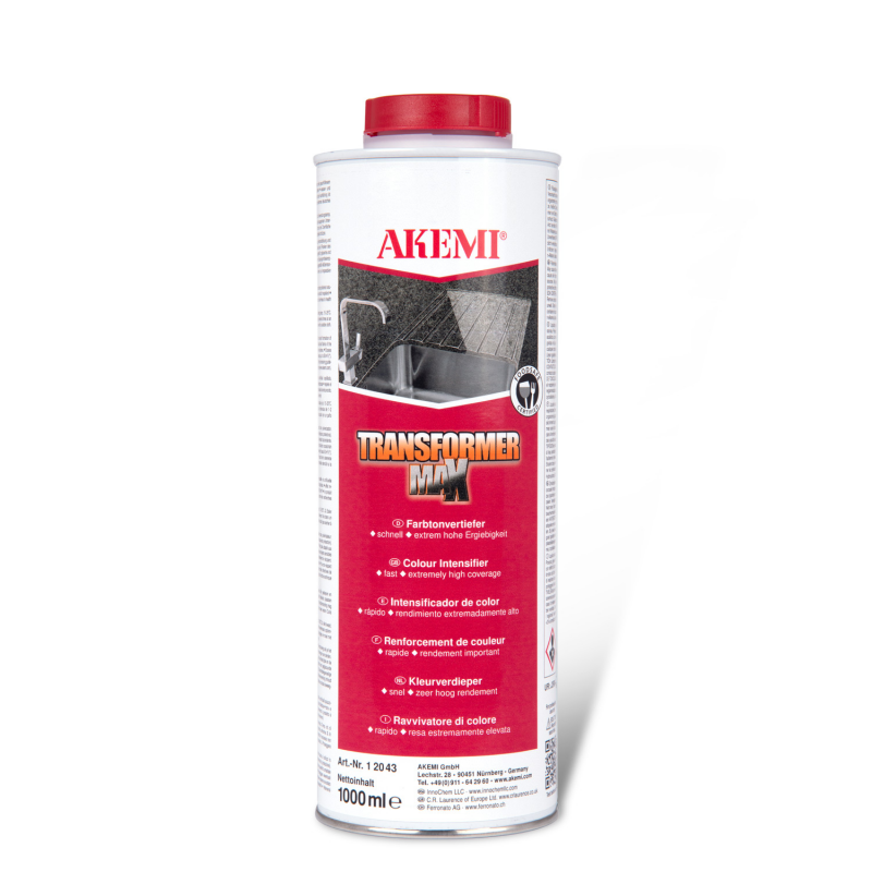 TRANSFORMER MAX Producto resistente a la intemperie para una intensificación rápida, fuerte y duradera de color para los interiores y exteriores. Especialmente apto para adaptar el color de los bordes (claros) trabajados y escurridores en superficies resinadas (oscuras) de mesas de trabajo. Para superficies pequeñas de piedra natural, terrazo, hormigón y Eginereed Stone. Para superficies de piedras cepilladas, satinadas, finamente lijadas y pulidas. Inofensivo para la salud en el sector alimentario (confirmado por un instituto externo alemán de prueba).