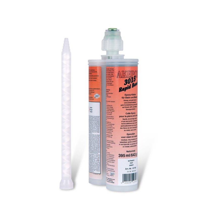 AKEPOX 3015 RAPID BOND Pegamento de 2 componentes de endurecimiento rápido (1:1) y capacidad de carga rápida, líquido, en cartuchos, dosificación exacta y mezcla homogénea. Para aplicar el producto hace falta pistola de 2 componentes.