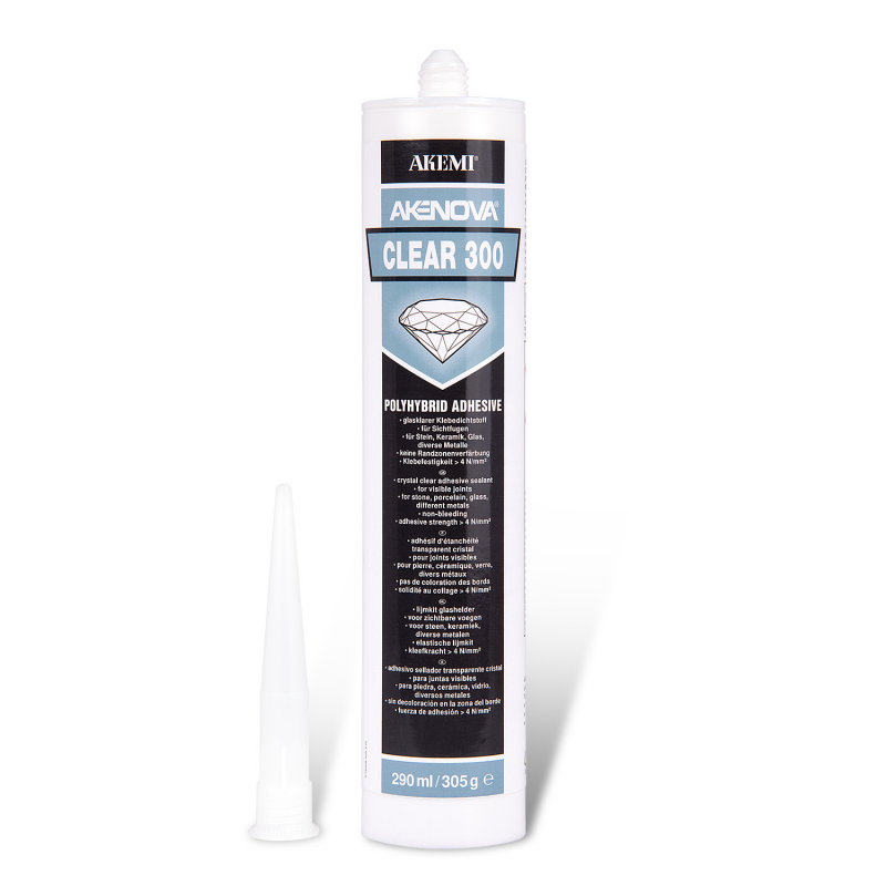AKENOVA 300 TRANSPARENTE Adhesivo monocomponente equilibrante de tensiones a base de tecnologia polihíbrida, el cual endurece a la humedad atmosférica. Muy adecuado para pegaduras sin pulido de piedra natural y artificial con el granito, cuarcita, arenisca, terrrazo y similares con superficies minerales, metálicas y madera.