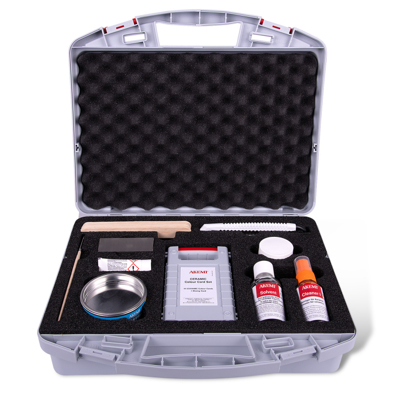 Maletín de Reparación Cerámica Para la reparación superficial de pequeñas zonas dañadas (como arañazos, desconchados) en superficies cerámicas (p. ej. suelos, escalones, alféizares de ventanas, encimeras y lavabos) en un proceso de 2 pasos: primero rellenar con PLATINUM P+ L-Especial transparente (adhesivo de epoxi acrilato) y, a continuación, adaptación del color a la superficie de cerámica circundante con el CERAMIC Colour Card Set (44 colores según el AKEMI COLOUR MATCHING SYSTEM). También se recomienda para retocar cantos de inglete.